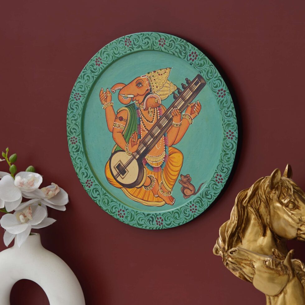 This beautiful pichwai painting features a majestic ganesh ji perched on a vibrant flowering branch.